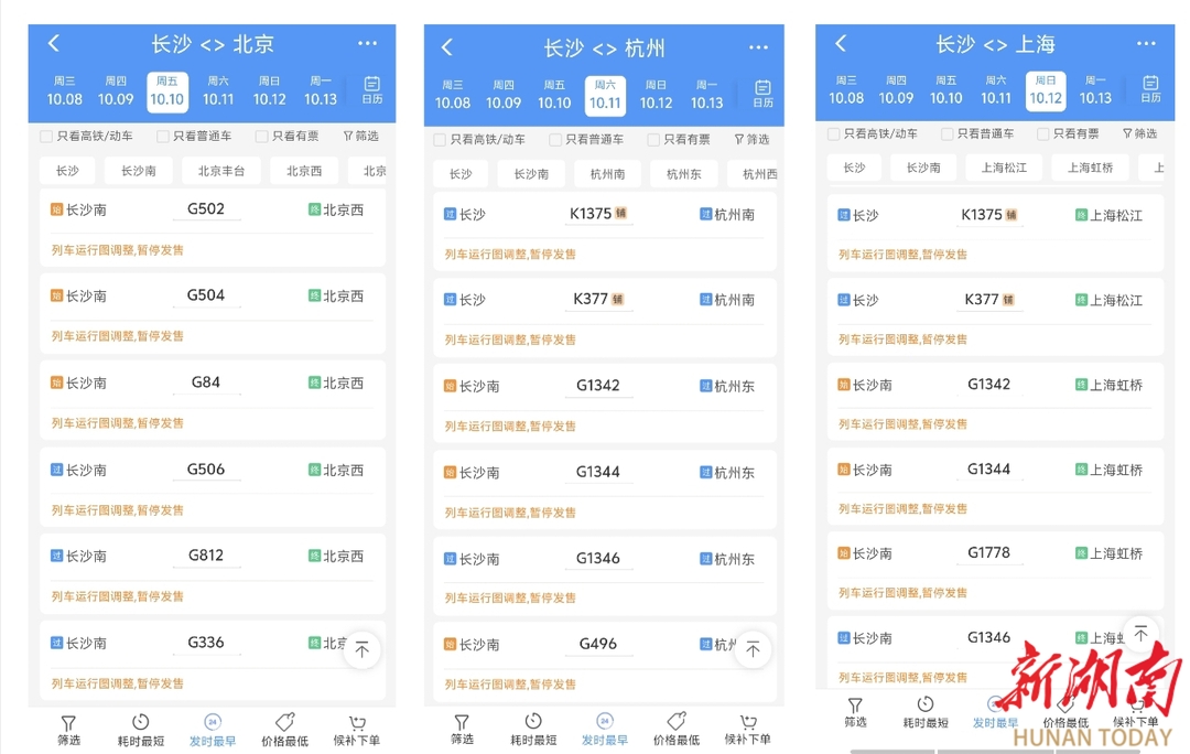 记者登录铁路12306APP查询发现,10月10日、11日、12日、13日,长沙前往北京、上海、杭州等多个热门城市的多个高铁车次,标注“列车运行图调整,暂停发售”,无法购买。