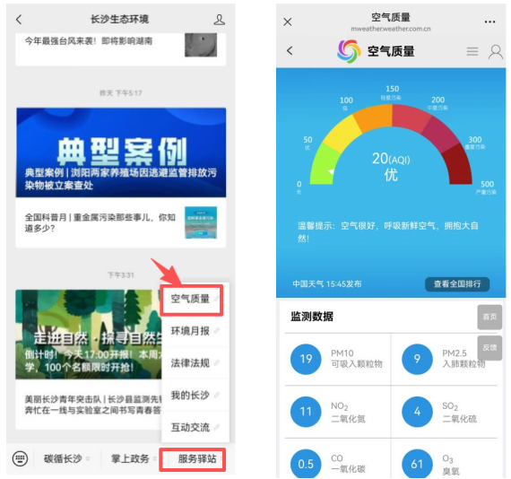关注“长沙生态环境”微信公众号,点击菜单栏“服务驿站”中的空气质量栏目。