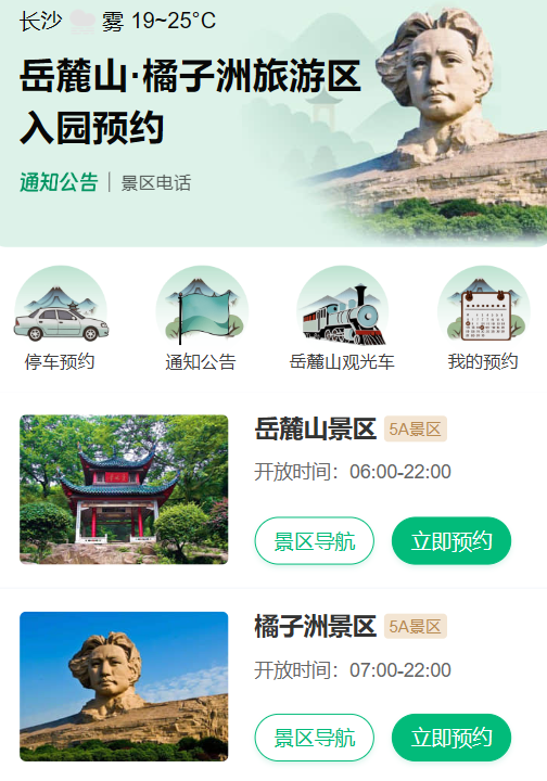 所有预约均需通过「岳麓山 橘子洲旅游区」微信公众号进行,其他平台预约无效!点击菜单栏「景点预约」即可进入预约系统。