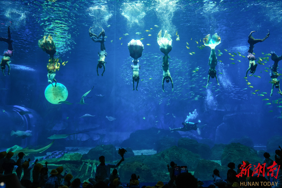 国潮新风尚则为长沙文旅注入了更多创意巧思。湘江欢乐海洋公园将“嫦娥奔月”的经典神话搬入水下,演员身着飘逸古装,以柔美的舞姿将中国古典美学与现代水下表演艺术完美融合,生动诠释“起舞弄清影,何似在人间”的浪漫意境,为游客带来极致的视觉享受,成为国庆期间的热门打卡项目,尽显“文旅 + 创意”的融合魅力。