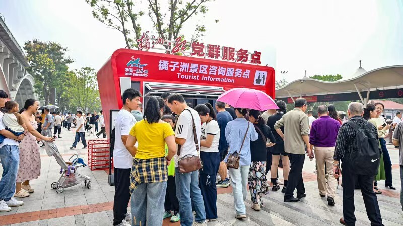 据介绍,为提升游客体验,橘子洲景区联合长沙城发橘子洲公司推动服务前置,在入口广场设立了两处标准化咨询服务岗亭,并以此为基础组建党员志愿服务队。国庆期间,景区每日投入工作人员与志愿者超过1300名,其中党员志愿者统一佩戴党员徽章、身着红马甲,在“橘洲红党群服务点”轮岗值守,积极“亮身份、树形象、当先锋”,成为服务游客的最前沿力量。
