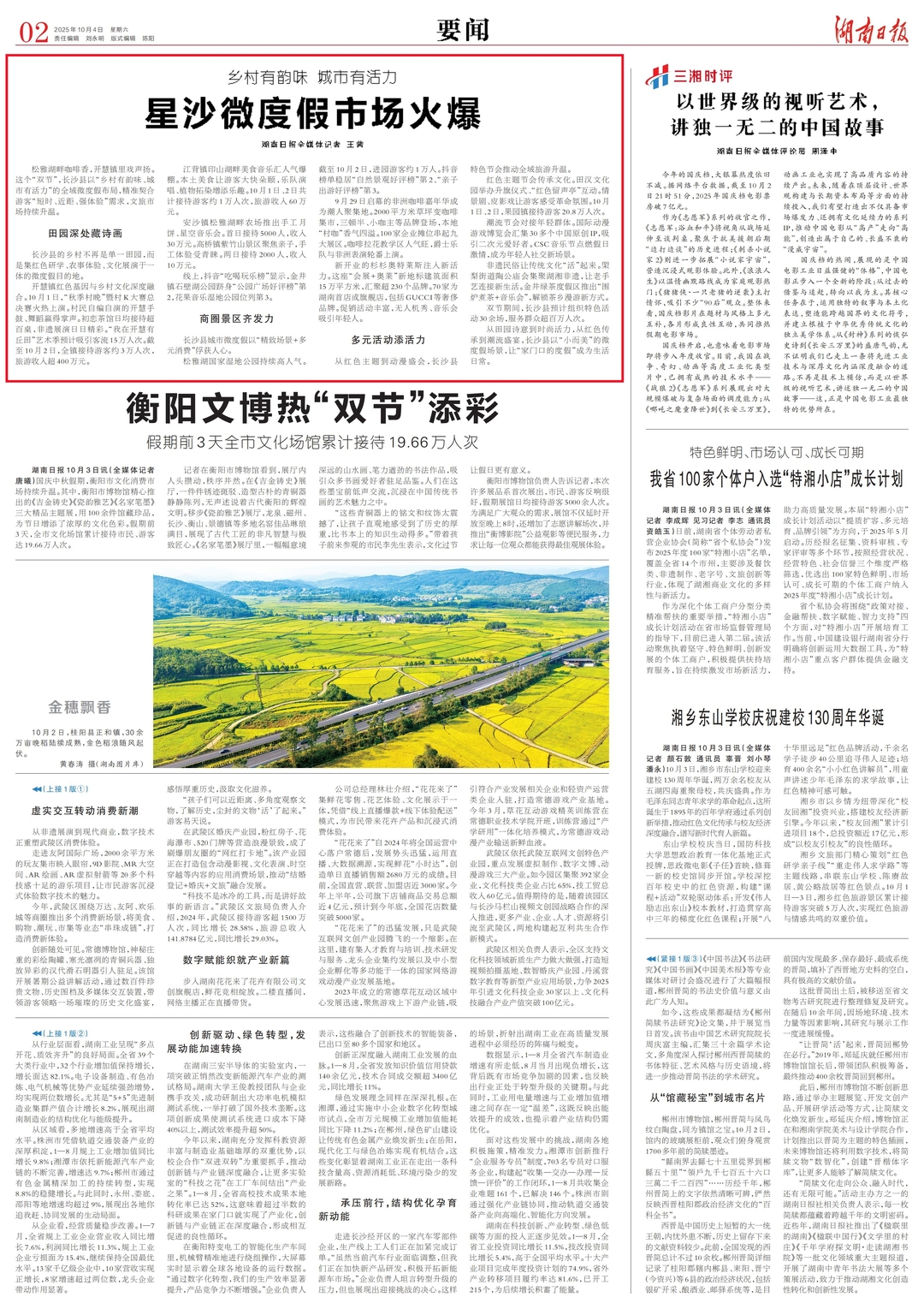 开慧镇红色基因与乡村文化深度融合。10月1日,“秋季村晚”暨村K大赛总决赛火热上演。村民自编自演的开慧手鼓、舞蹈赢得掌声。初恋茶馆日均接待超百桌,非遗展演日日精彩。“我在开慧有丘田”艺术季预计吸引客流15万人次。截至10月2日,全镇接待游客约3万人次,旅游收入超400万元。