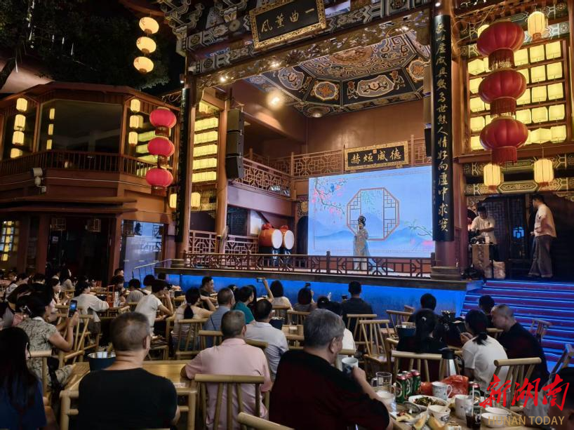 红墙、浮雕、火焰图腾,火宫殿总店现场人头攒动,庙坪中间巨伞上“中华盛世,火曜九天”的文字与热闹的节日氛围相得益彰。花鼓戏的激昂鼓点、传统弹词的婉转唱腔、经典民歌的鸳鸯唱法,一个个表演精彩纷呈,吸引着往来游人入座品茶观戏。