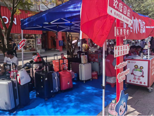 “您好,需要寄存行李吗?我们可以免费为您保管。”10月1日上午,在长沙市天心区黄兴广场,身着红马甲的志愿者热情询问,为游客讲解注意事项。服务站里行李箱整齐有序地罗列着,个个佩戴专属“护照”。