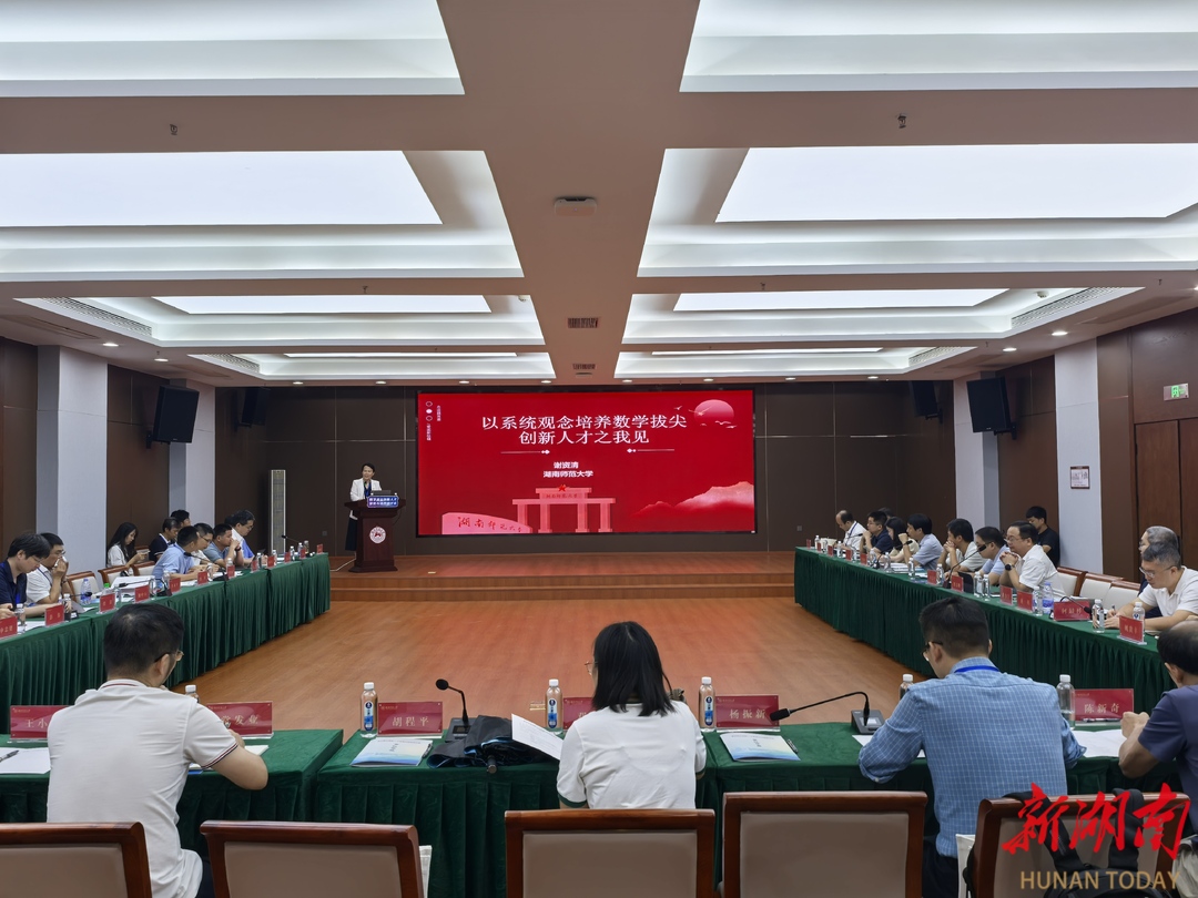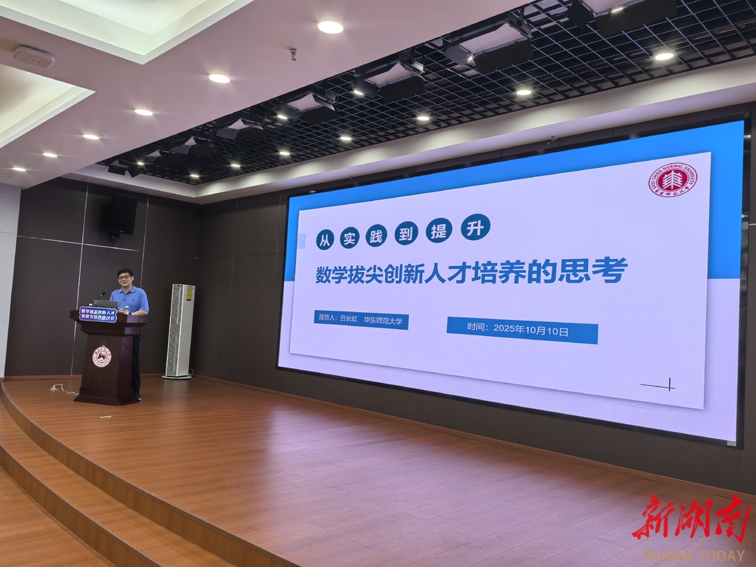 湖南日报·新湖南客户端10月12日讯(记者 陈新)10月10日上午,由华东师范大学数学拔尖创新人才培养研究中心与湖南师范大学数学与统计学院联合主办的“数学拔尖创新人才发现与培养研讨会”在长沙顺利举行。本次会议旨在落实国家关于拔尖创新人才培养的战略要求,深化华东师范大学与湖南省的教育合作。来自国防科技大学、中南大学、华东师范大学、湖南大学、湖南师范大学、湘潭大学等高校数学学院负责人,湖南省多所重点中学的校长、数学教研组长等近50名专家参会。