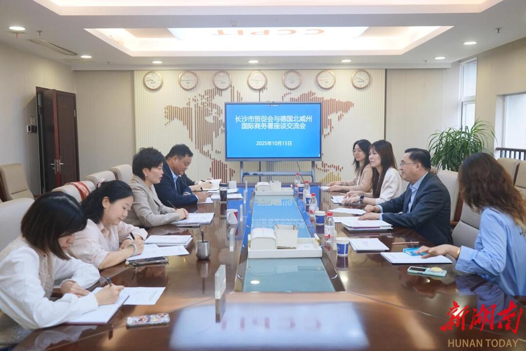 湖南日报·新湖南客户端10月22日讯(通讯员 张延)10月15日下午,德国北威州国际贸易署驻华首席代表封兴良先生一行莅临长沙市贸促会访问交流。长沙市贸促会党组书记、会长喻霞元陪同参观并介绍了市贸促会国际交流阵地,围绕长沙与北威州政商合作基础及未来发展方向作深入交流。