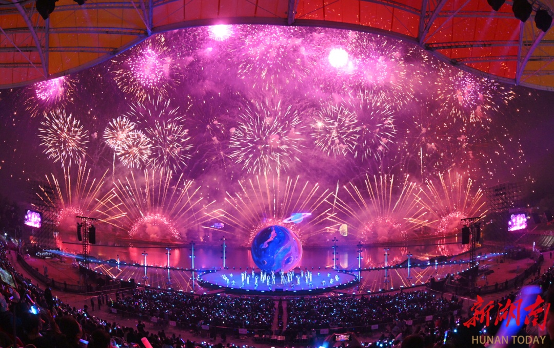 湖南日报·新湖南客户端10月24日讯(记者 王文 摄影 范远志)160米高的“烟花光塔”瞬间点亮夜空,“地球之心”在天地间幻化宇宙万象。今晚,第十七届浏阳花炮文化节在浏阳天空剧院拉开帷幕,数十万名观众在流光溢彩中开启追光之旅。