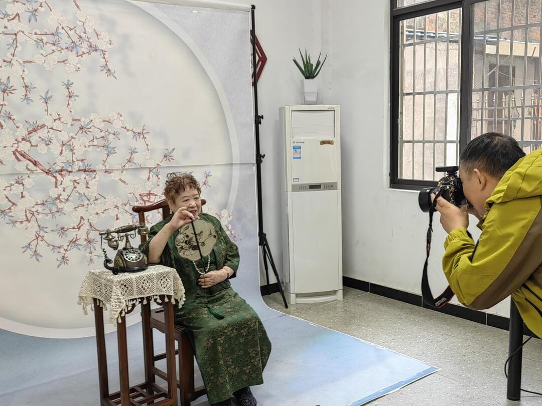 在“怀旧主题摄影”区,老人们在志愿者细心帮助下,换上精致的中山装、优雅的旗袍等具有时代特色的服饰,精神焕发地在充满年代感的布景前拍摄照片。拍摄不仅定格笑容,更成为一次温暖的回忆唤醒。工作人员轻声引导长者分享与服饰、年代相关的故事,快门声、笑语声此起彼伏,场面温馨动人。每位完成拍摄的60岁以上长者都获赠一个精美的8寸摆台相框,将这一刻的美好永久珍藏。