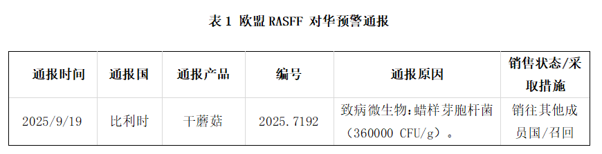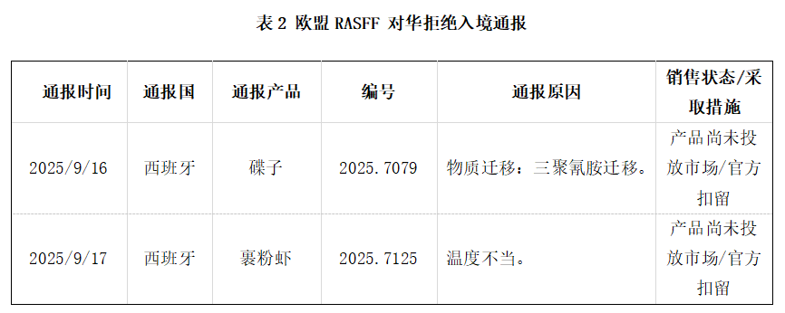 日前,欧盟食品和饲料类快速预警系统(RASFF)发布了2025年第38周通报。针对中国大陆输欧产品,预警通报1项,拒绝入境通报2项,信息通报6项。具体信息如下: