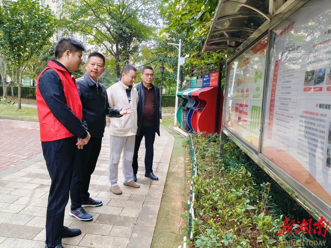 街道物管办主任吴宏伟(左二)在橄榄城小区指导小区治理。