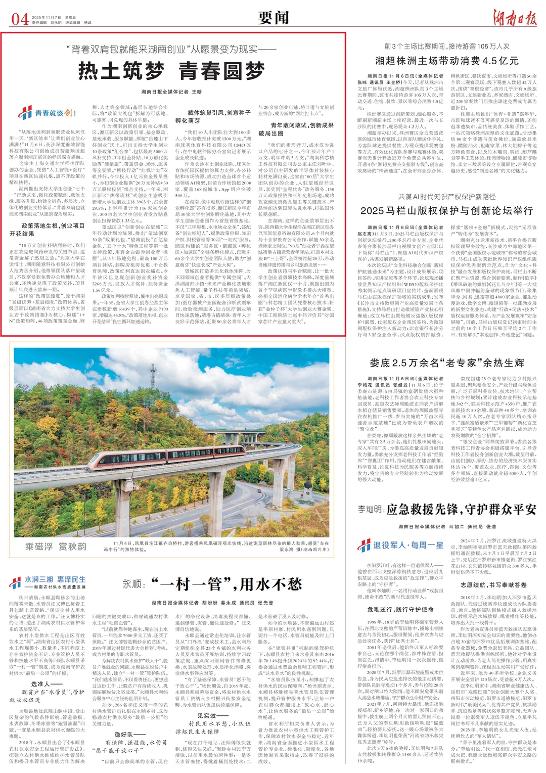 在湖南,这样的创业故事层出不穷。陕西籍大学生程浩在湘江新区创办氕氘氚信息咨询有限公司,6个月内就与十余家教育公司合作,赋能30余名老师走上岗位;“90后”创业者宁垚在望城靖港古镇运营青年驿站,打造乡村文旅IP“三土哥”,全网粉丝超20万,带动当地非遗传播与乡村旅游发展……