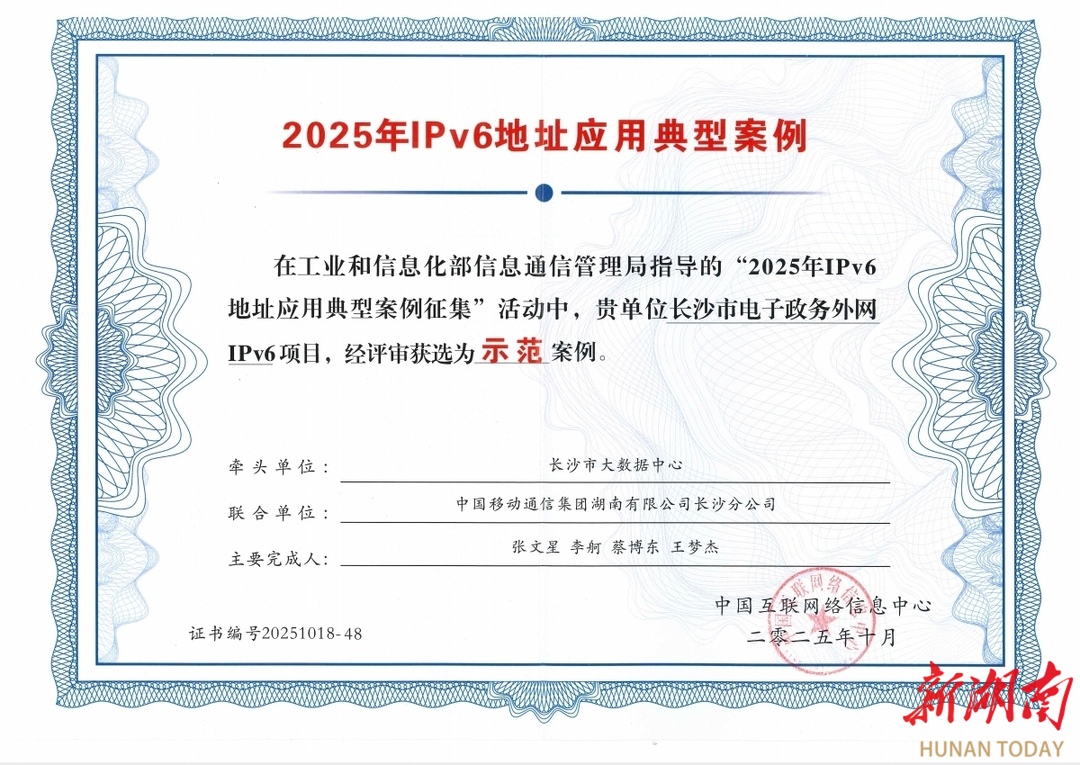 湖南日报·新湖南客户端11月7日讯(通讯员 李舸)近日,从工业和信息化部信息通信管理局指导、中国互联网络信息中心(CNNIC)主办的“2025年IPv6地址应用典型案例征集活动”上传来喜讯——由长沙大数据中心联合中国移动通信集团湖南有限公司长沙分公司申报的《长沙市电子政务外网IPv6改造升级方案》,从全国近160个参选案例中强势突围,成功入选“2025年IPv6地址应用典型案例”名单。这一国家级荣誉,标志着长沙在政务网络IPv6深度部署与创新应用领域走在了全国前列。