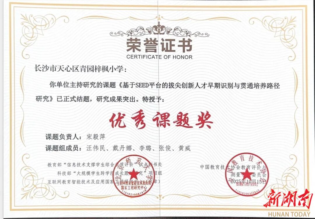 湖南日报·新湖南客户端11月7日讯(记者 彭诗思 通讯员 戴春兰)近日,在北京国家会议中心举办的“第八届中国教育技术创新发展与应用成果大会”上,长沙市天心区青园梓枫小学申报课题《基于SEED平台的拔尖创新人才早期识别与贯通培养路径研究》(立项编号:2025SEED197),获评教育部公布的国家级“优秀课题”。