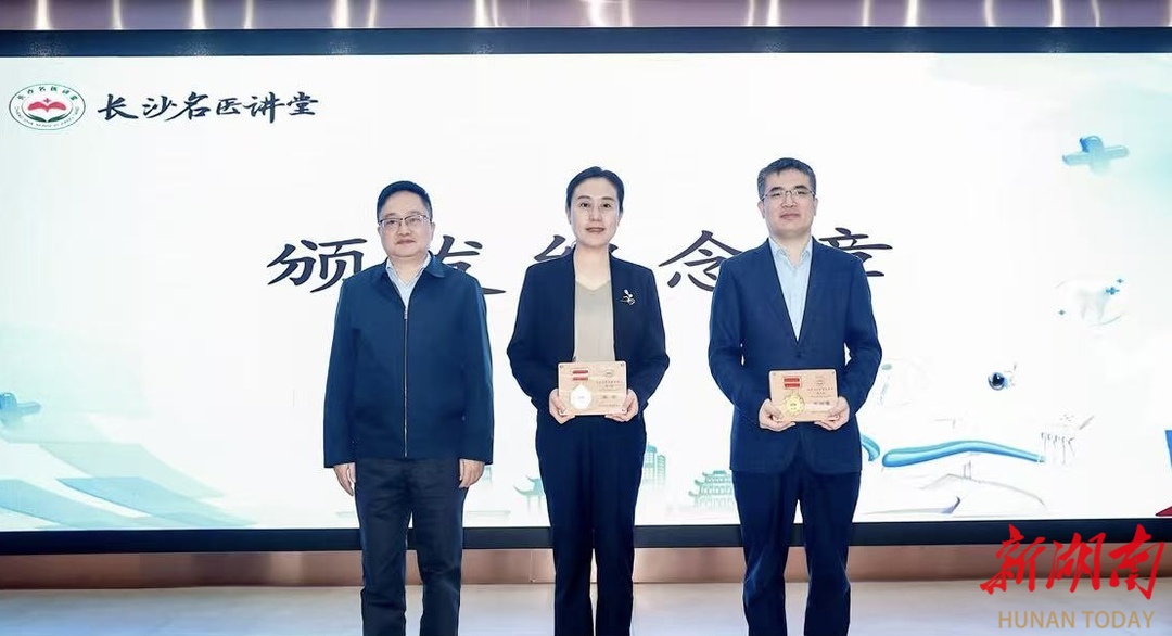 长沙市卫生健康委党组成员、副主任周建波为两位主讲专家颁发“长沙名医讲堂主讲人”纪念章。