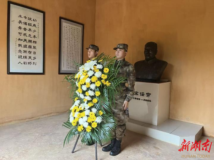 故居庭院内气氛庄重,学校教官队成员手捧花篮,稳步走向宋任穷同志铜像并敬献花篮。全体学子肃立鞠躬,向这位一生坚守清廉的开国上将致以崇高敬意。