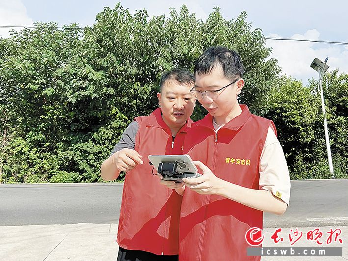 长沙市生态环境局宁乡分局青年突击队成员正在遥控无人机,巡查露天焚烧现象。