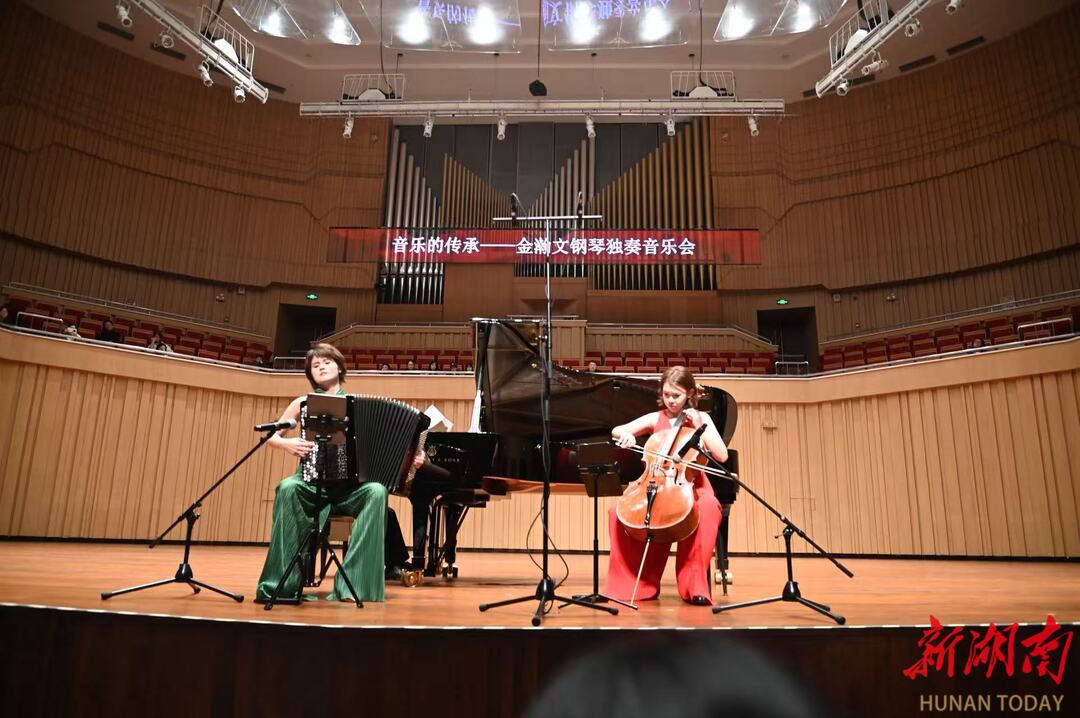 “传承”的主题不仅体现在曲目选择上,更贯穿于演出形式之中。音乐会上,金瀚文的长沙籍学生、浙音管弦系大提琴专业学子彭胡湾与老师携手,深情演绎了皮亚佐拉的经典探戈作品《遗忘》,展现了师徒间的艺术默契。更为惊喜的是,金瀚文的夫人、浙江音乐学院手风琴专业副教授吴雯怡亦登台献艺,一曲《弹起我心爱的土琵琶》为这场西洋乐器音乐会增添了别样的民族风情与温馨的家庭氛围,立体呈现了师生、亲人之间多维度的音乐传承图景。最终音乐会在经久不息的掌声中落下帷幕。