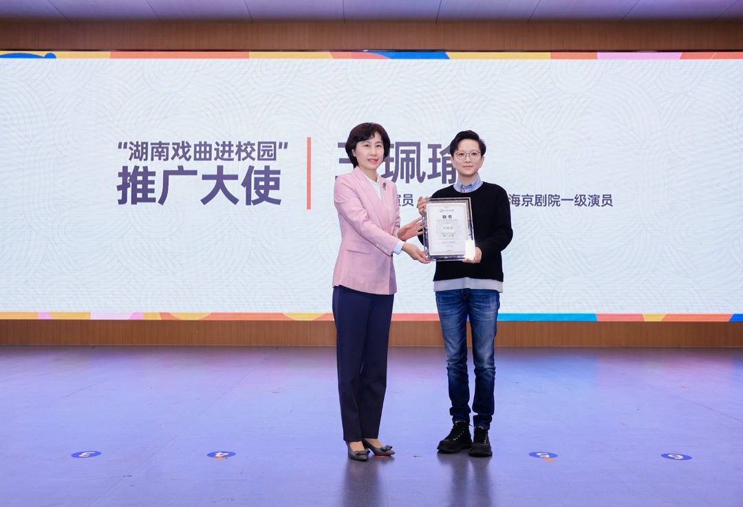 闭幕式现场,“湖南戏曲进校园”发布仪式成为一大亮点。活动发布了湖南省“湖南戏曲进校园”活动视频,著名京剧演员、余派传人、上海京剧院一级演员王珮瑜受聘为推广大使,接过了传统戏曲传承传播的重要使命。