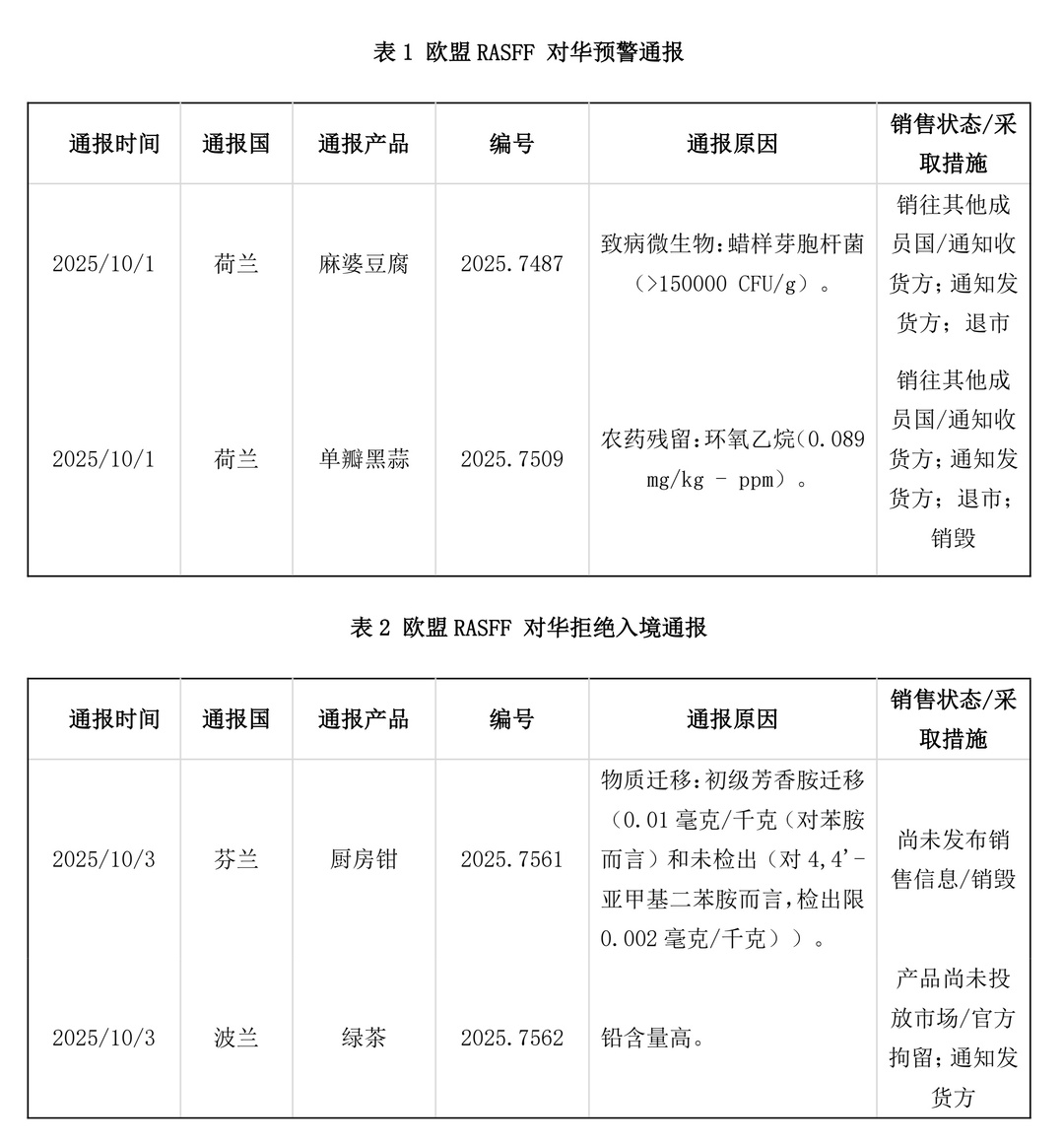 日前,欧盟食品和饲料类快速预警系统(RASFF)发布了2025年第40周通报。针对中国大陆输欧产品,预警通报2项,拒绝入境通报2项,信息通报6项(不包括对中国香港特别行政区和台湾地区的通报)。具体信息如下:
