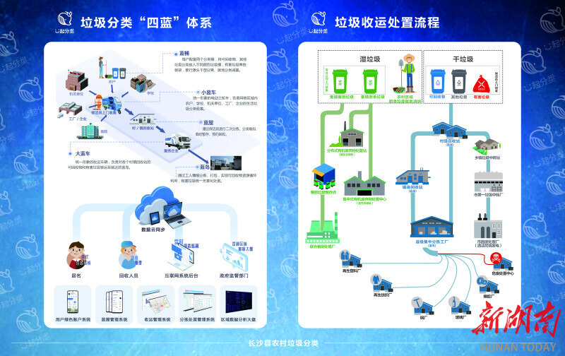 图为长沙县农村垃圾分类四蓝体系及垃圾分类回收流程。