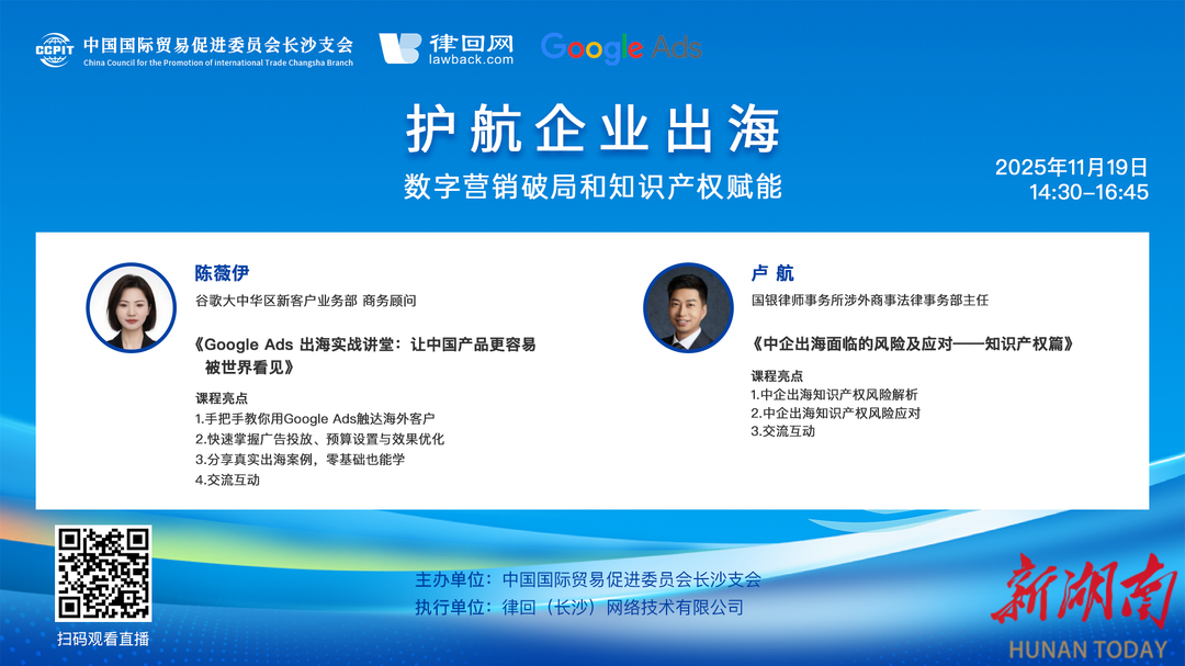 湖南日报·新湖南客户端11月21日讯(通讯员 周恬)为助力长沙企业破解海外推广难题、健全知识产权防护体系,11月19日,由长沙市贸促会主办、律回网承办、谷歌新客户业务部协办的“护航企业出海:数字营销破局和知识产权赋能”线上培训成功举行。本次活动紧扣企业出海实际需求,特邀行业专家进行专业指导,吸引超3000人次在线观看。