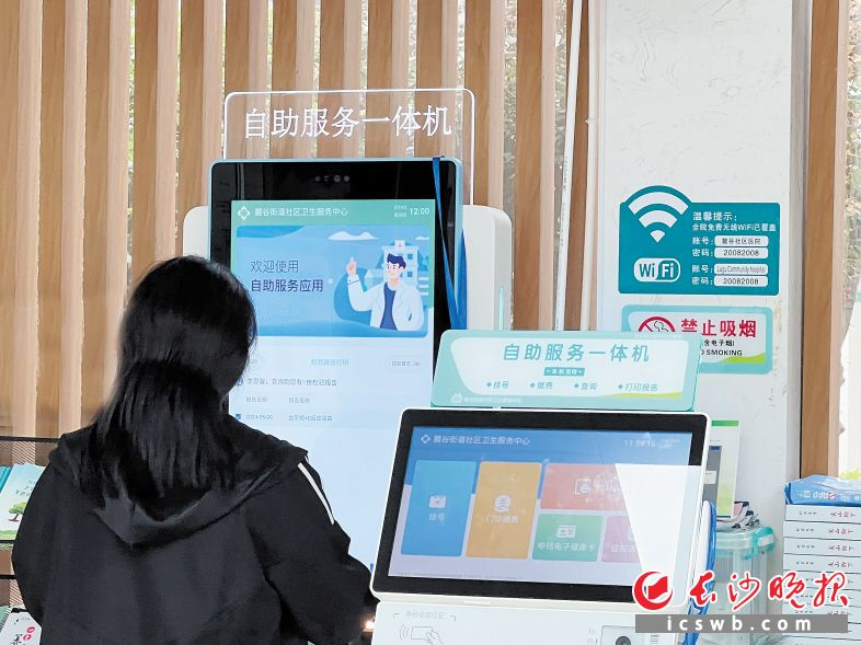 麓谷街道社区卫生服务中心门诊大厅,居民使用自助服务一体机进行挂号、缴费。