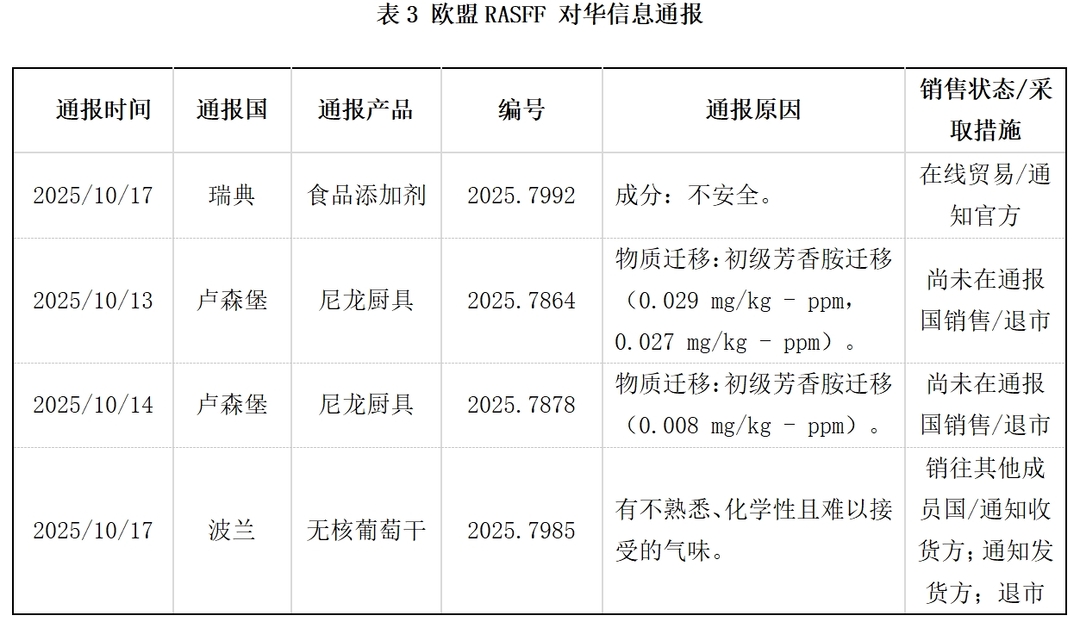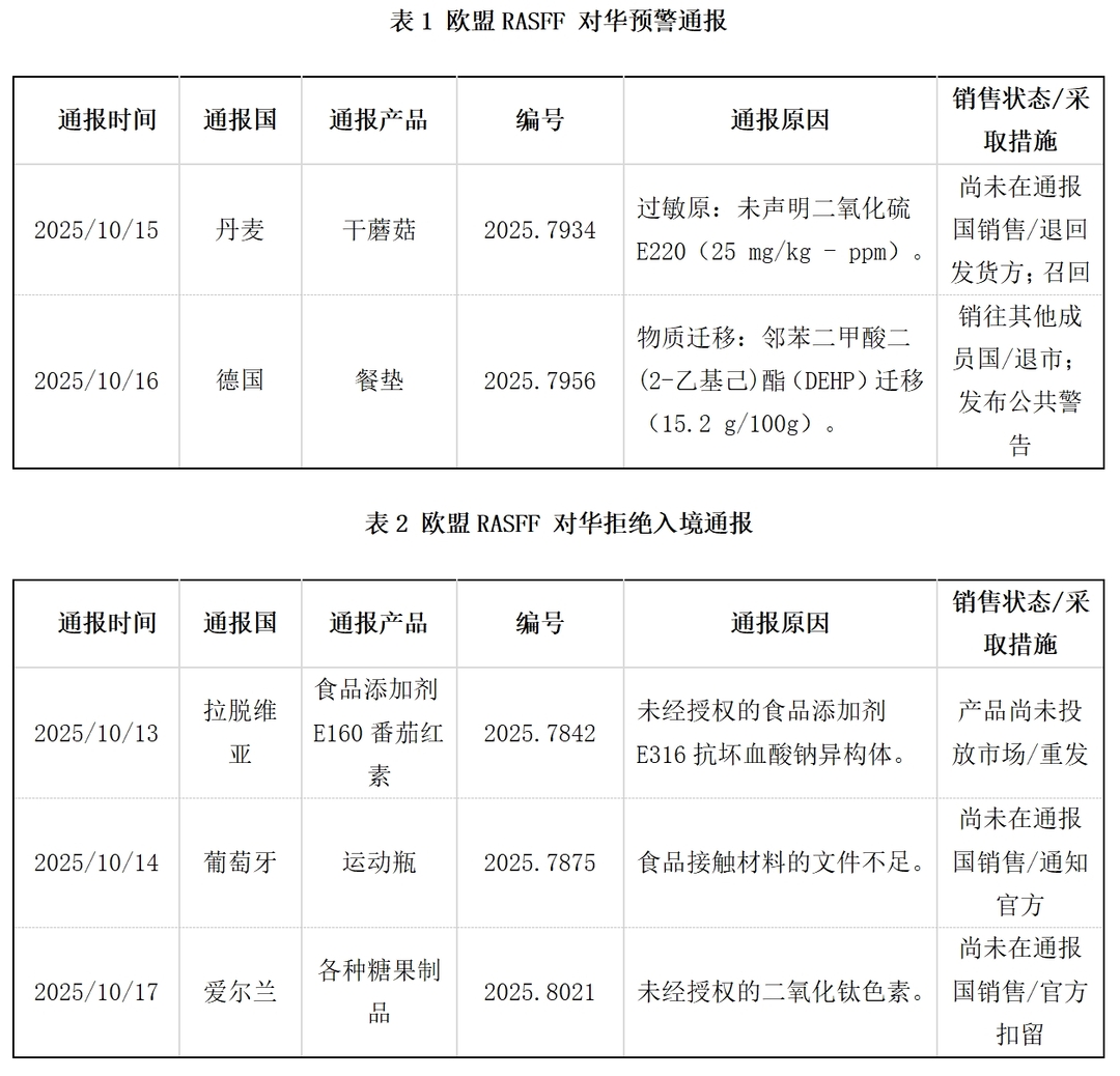 日前,欧盟食品和饲料类快速预警系统(RASFF)发布了2025年第42周通报。针对中国大陆输欧产品,预警通报2项,拒绝入境通报3项,信息通报4项(不包括对中国香港特别行政区和台湾地区的通报)。具体信息如下: