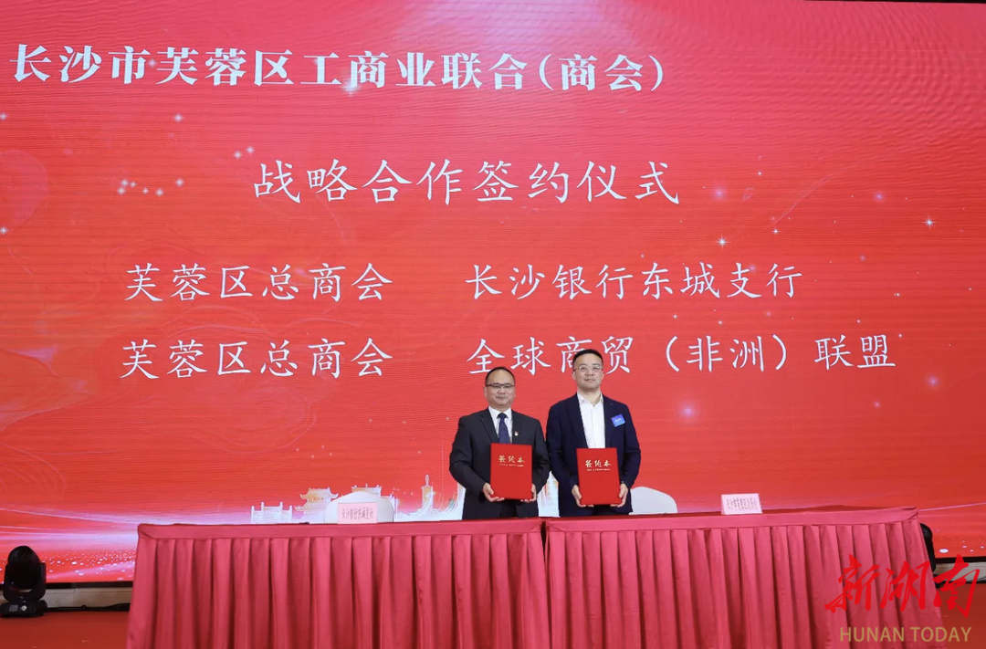 刘重为芙蓉区总商会15位“招商大使”颁发聘书,以仪式感凝聚责任担当,激励广大企业家以商引商、以商稳商,为芙蓉区招商引资再立新功。在战略合作签约仪式上,芙蓉区总商会分别与长沙银行东城支行、全球商贸(非洲)联盟达成合作,将围绕金融赋能民营经济、搭建湘非商贸合作桥梁等方面深化协作,为区域产业升级与对外开放拓展新空间。