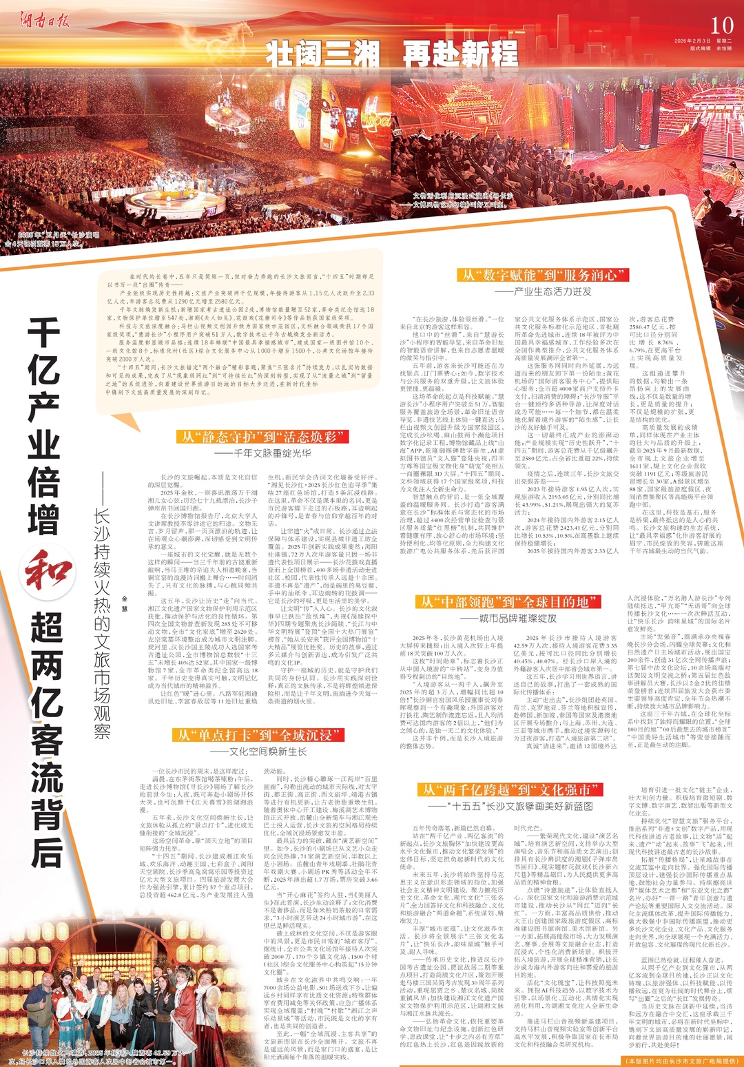 从两千亿产业到文化强市,从两亿客流到全球目的地,长沙正以文化铸魂、以旅游强体、以科技赋能、以传播致远,在更为壮阔的时代舞台上,续写“出圈”之后的“长红”发展传奇。
