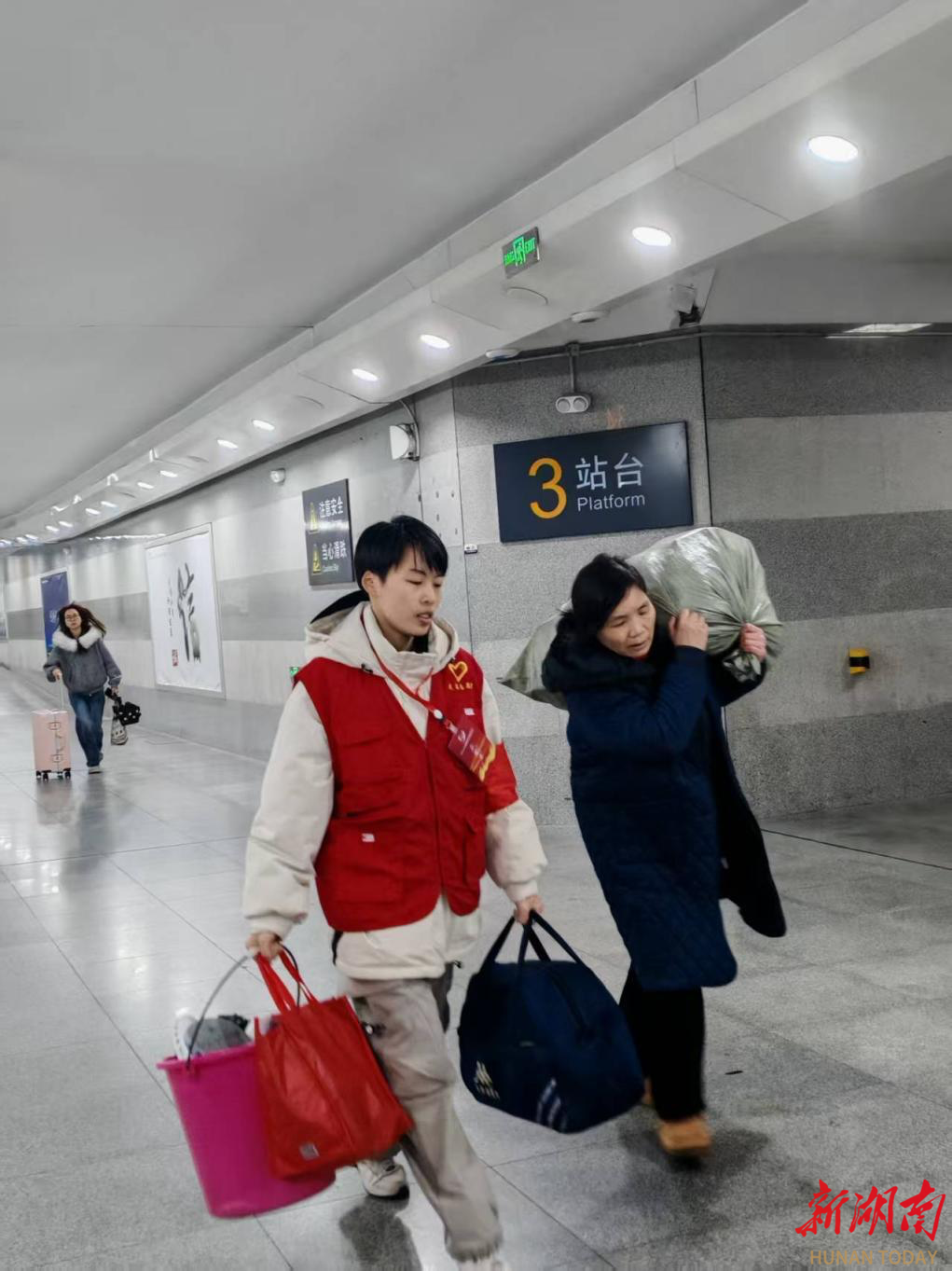除了浓浓的文化年味,实打实的便民服务更让旅客倍感贴心。身着红马甲的志愿者们化身 “移动服务站”,随时为旅客排忧解难。看到携带重物的旅客,他们主动上前帮忙搬运行李,稳稳的托举间传递着温暖;遇到不知乘车路线的旅客,他们耐心细致地提供交通指引,手绘简易路线图、告知换乘节点,确保旅客顺利出行;面对咨询旅游攻略的中外游客,志愿者们详细介绍橘子洲、岳麓山等长沙知名景点,推荐特色美食与便捷出行方案;针对票务查询、改签等需求,志愿者们协助旅客操作自助设备,为老年旅客提供人工引导,让购票流程更顺畅。同时,失物招领服务台始终有人值守,及时登记、核对、归还旅客遗失的身份证件、行李物品,为旅途保驾护航。