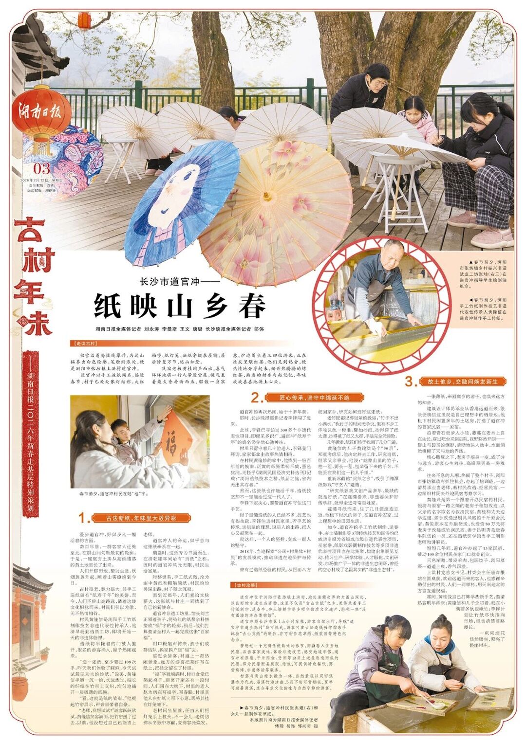 此次同步刊发的报道,源于湖南日报社精心策划的新春走基层特别策划《古村年味》。该系列旨在深入弘扬春节文化,自2月10日至23日,每日聚焦湖南一个古村落,探寻其独特的年俗文化与振兴故事。道官冲的“古法新纸”,正是这一宏大叙事中,关于文化传承与创新发展的精彩一章。