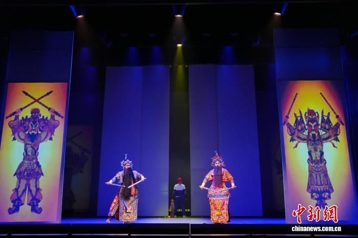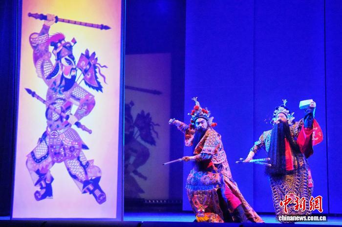 2月12日,非遗奇幻音乐戏剧《夏小正·奇幻年》在长沙首演。剧目源自古老农事历书《夏小正》,将皮影、剪纸、年画等非遗与光影相融,为少年儿童讲述充满年味的中国新春故事。图为演员与皮影互动演出。中新社记者 杨华峰 摄