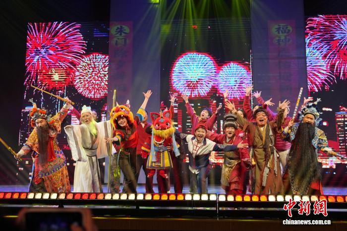 2月12日,非遗奇幻音乐戏剧《夏小正·奇幻年》在长沙首演。剧目源自古老农事历书《夏小正》,将皮影、剪纸、年画等非遗与光影相融,为少年儿童讲述充满年味的中国新春故事。图为演员们祝贺观众新年快乐。中新社记者 杨华峰 摄