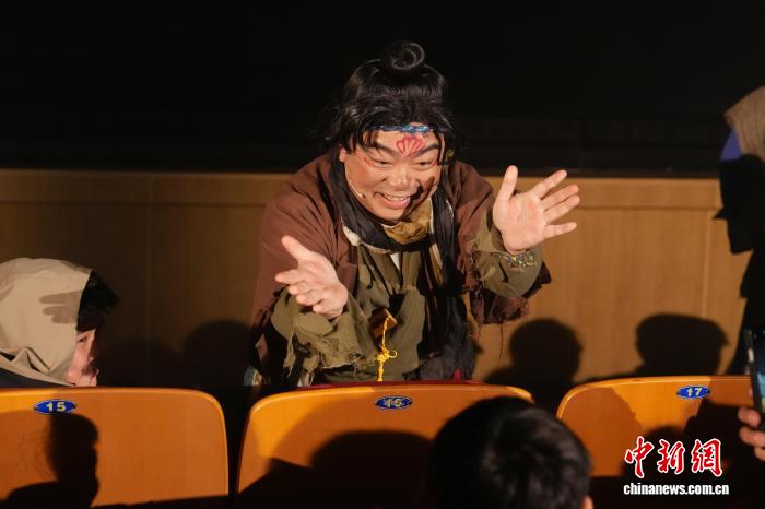2月12日,非遗奇幻音乐戏剧《夏小正·奇幻年》在长沙首演。剧目源自古老农事历书《夏小正》,将皮影、剪纸、年画等非遗与光影相融,为少年儿童讲述充满年味的中国新春故事。图为演员与孩子们互动。中新社记者 杨华峰 摄
