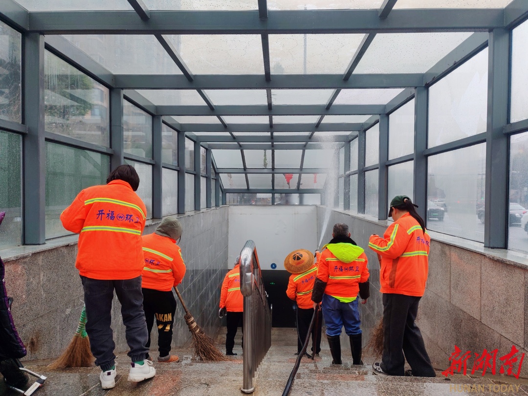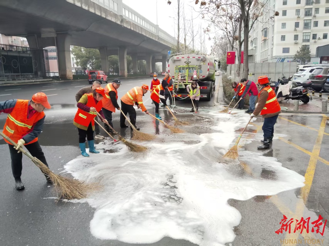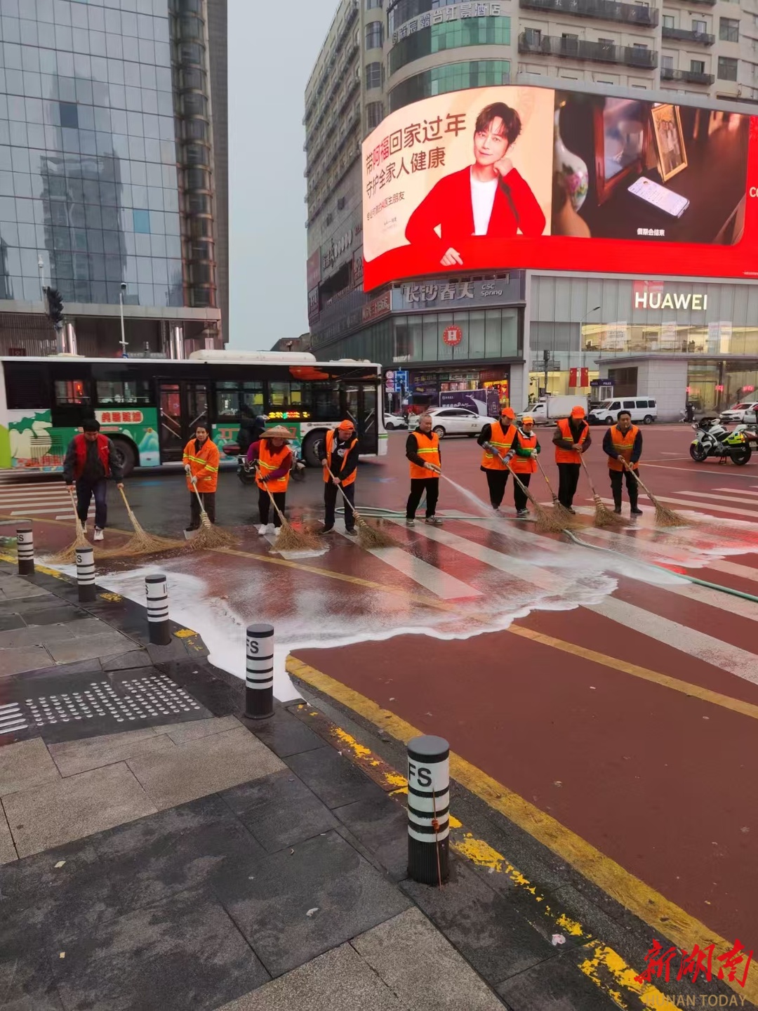 全天,“除尘保洁焕新颜,平安喜乐迎新春”周五大扫除活动全面展开。岳麓山脚下,湘江新区的环卫工人在新民路开展精细化保洁;长沙火车站进站口,芙蓉区的保洁队伍正擦拭栏杆、清理死角;三馆一厅周边,开福区湘雅路环卫所的工作人员手持工具,对路面油污、“牛皮癣”进行彻底清理。