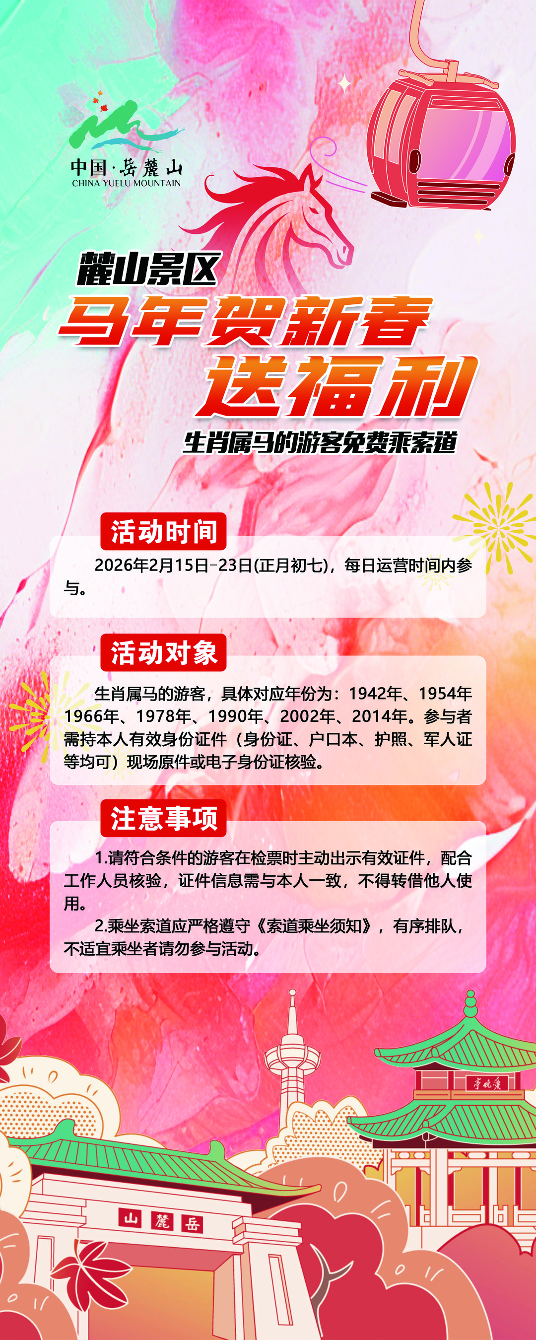 2月15日至23日(正月初七),麓山景区重磅推出索道春节专属宠粉活动,属马游客专属福利,免费乘索赏美景!凡是1942年、1954年、1966年、1978年、1990年、2002年、2014年出生的属马游客,凭本人身份证、户口本、护照等有效证件(原件或电子凭证均可),检票时主动配合工作人员核验,即可免费乘坐索道,登顶麓山,俯瞰湖湘新春全景,解锁不一样的年味视角。温馨提示:证件信息需与本人一致,不可转借他人,乘坐时请遵守《索道乘坐须知》,有序排队,让安全与惬意相伴旅途。