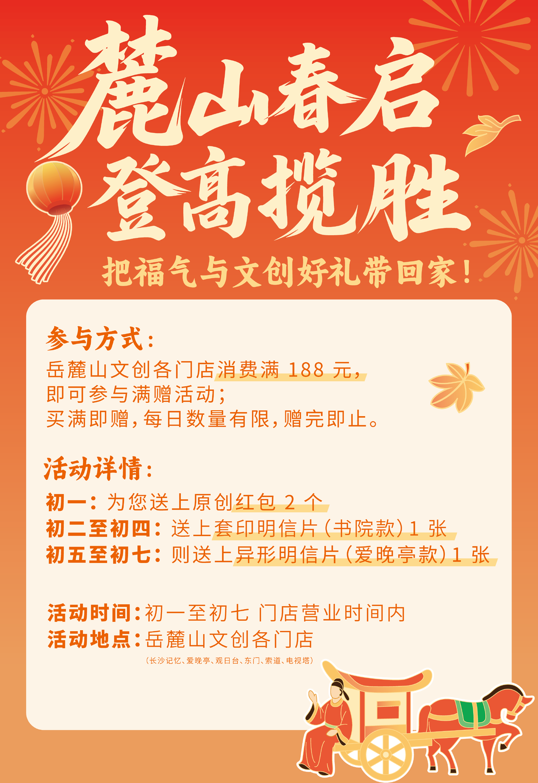 岳麓山文创宠粉再加码,初一至初七,前往岳麓山文创门店(长沙记忆、爱晚亭、观日台、东门、索道、电视塔)消费满188元,即可参与满赠活动,买满即赠,每日数量有限,赠完即止!初一赠原创红包2个(沾马年喜气);初二至初四赠套印明信片(书院款)1张(藏湖湘文脉);初五至初七赠异形明信片(爱晚亭款)1张(留麓山记忆),美食与文创兼具,让湖湘韵味成为你马年新春最特别的伴手礼。