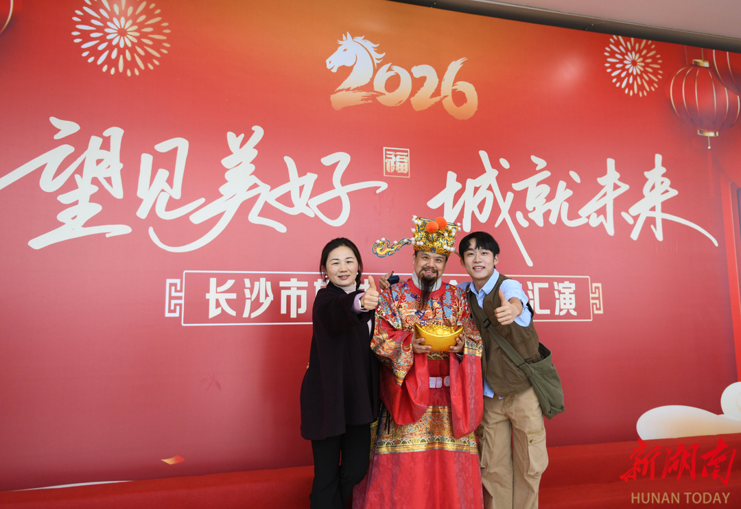 会场之外,新春文化市集热闹开市。非遗、农文旅产品展示区里,人们兴致勃勃地欣赏民间剪纸、弘文面塑、糖画制作等非遗技艺,品尝小钵子甜酒、靖港坛子菜、舒记鲜果等当地特产;传统年俗互动区内,福、禄、寿、喜、文武财神NPC送礼送福、喜气洋洋,投壶、射箭、木射等传统游戏吸引群众积极参与;新年打卡区更是人流如织,人们纷纷合影留念,送出新年祝福,现场欢声笑语不断。